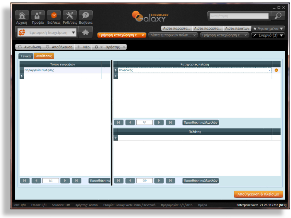Η ενεργοποίηση μιας εμπορικής πολιτικής απαιτεί τον καθορισμό κανόνων ενεργοποίησης. Για το σκοπό αυτό θα πρέπει να μεταβείτε στη σχετική σελίδα (της οθόνης Γρήγορη καταχώριση) και να αναθέσετε την εμπορική πολιτική στους ενδεδειγμένους “πελάτες/ προμηθευτές”, “κατηγορία πελάτη/προμηθευτή”, “τύπους παραστατικού (αγορών/ πωλήσεων)” π.χ. παραγγελία πώλησης στους πελάτες χονδρικής .