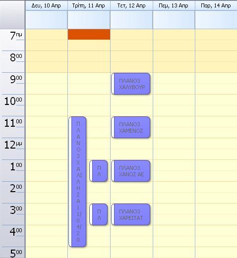 Στο Ημερολόγιο διακρίνονται οι δραστηριότητες του επιλεγμένου πόρου για τον οποίο το πλάνο επισκέψεων δημιουργήθηκε .