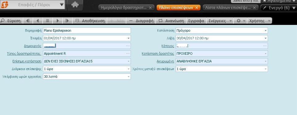 Κάντε διπλό κλικ πάνω στο πλάνο επισκέψεων που μόλις δημιουργήσατε. Θα εμφανιστεί το παράθυρο με όλα τα στοιχεία του πλάνου . Το παράθυρο του πλάνου είναι ουσιαστικά ένα παράθυρο προβολής και συμπεριφέρεται με το γνωστό τρόπο . Όλα σχεδόν τα πεδία του πλην της “περιγραφής” και της “κατάστασης” έρχονται ανενεργά, οπότε δεν επιτρέπεται καμία επέμβαση σε αυτά.